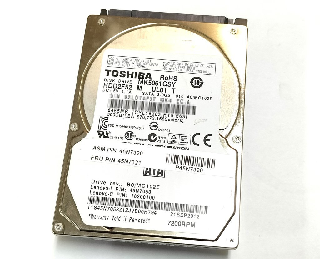 (稼働11647h)Lenovo 45N7320 (Toshiba MK5061GSY) 500GB 2.5インチ SATA300 9.5mm厚 7200rpm TQK4