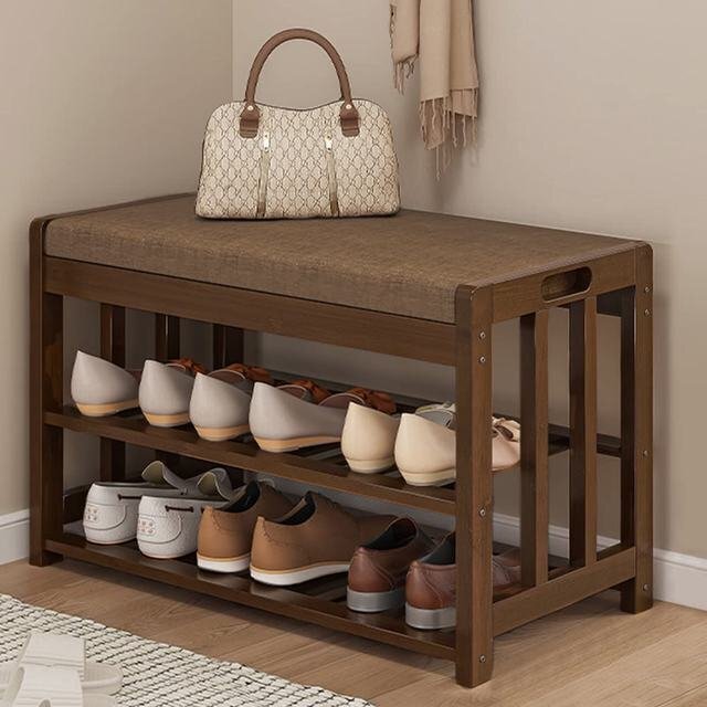 - LRM2059玄関ベンチ 3段式靴収納 シューズラック 玄関収納 収納ベンチ竹製 玄関椅子反発クッション コンパクト下駄箱 靴箱 シューズボックス