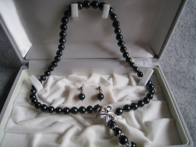 > [SAMU]素敵!!照りバロックアコヤ黒真珠 ネックレス珠7.3~7.5㎜&ピアス珠7.5mm 2点セット新品!