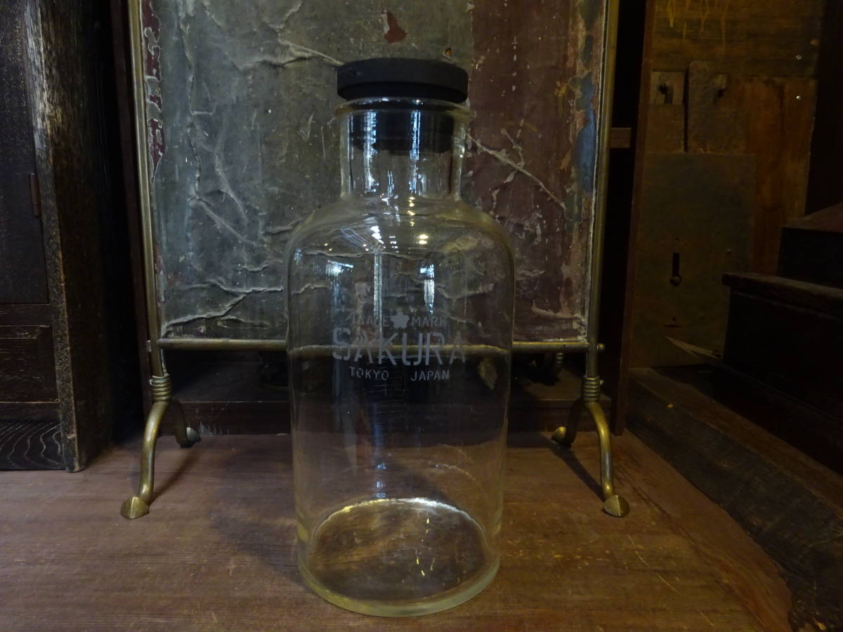 - 【蓋付のSAKURAガラス瓶】ゴム蓋標本ドライフラワー花屋実験器具昭和レトロオブジェ古道具アンティークインテリアインダストリアル骨董