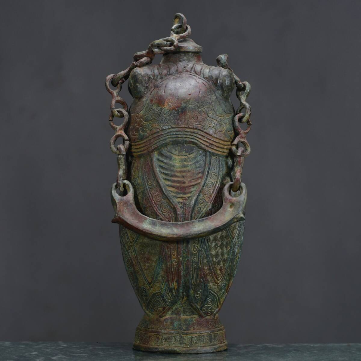- 【超珍館蔵】戦漢 青銅製 蝉紋提梁壺 置物 古賞物 古美術品 稀少珍蔵品