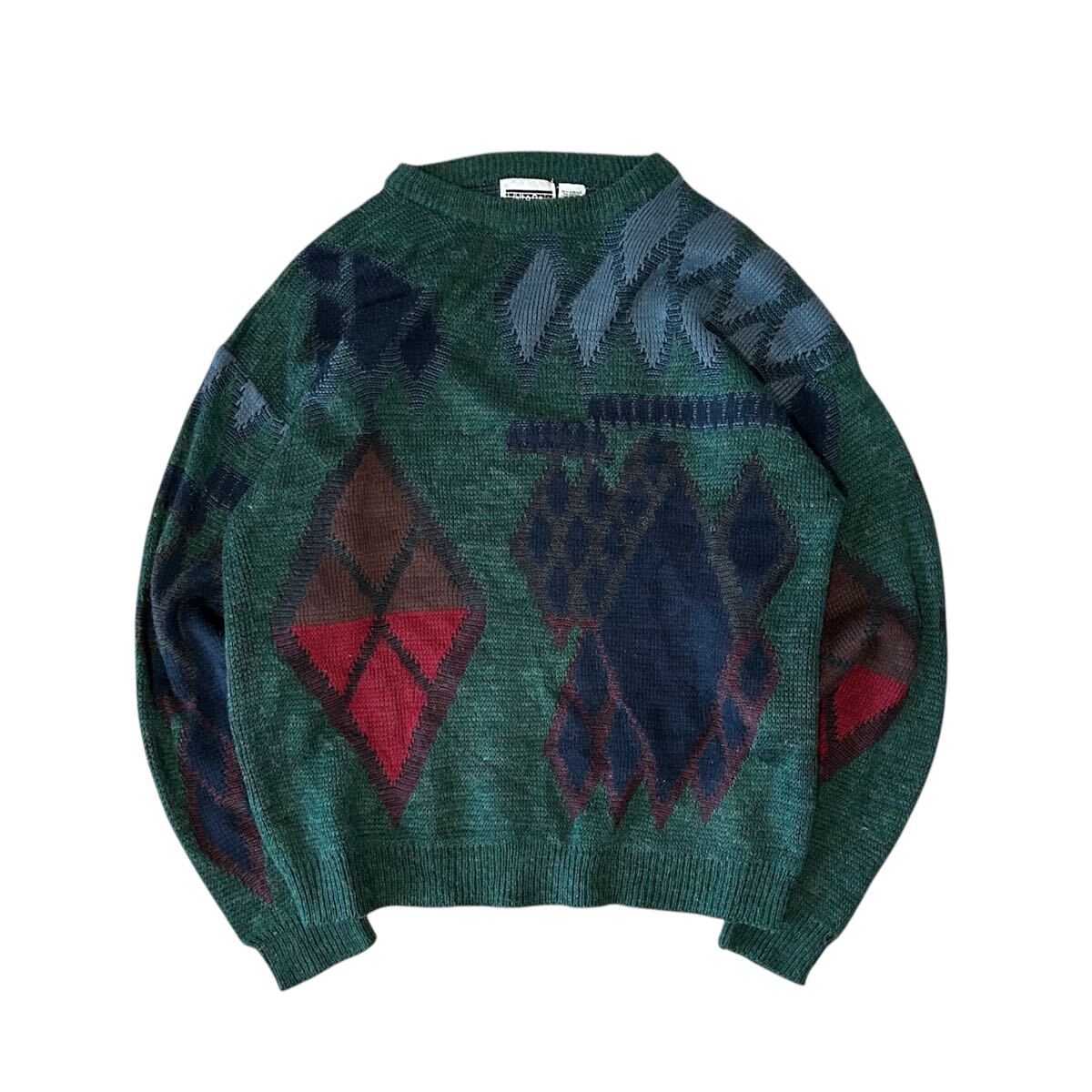 > 90’s White Oak アクリルニット XLサイズ グリーン 総柄 セーター クルーネック ビンテージ アーガイル アクリル ウール レーヨン 90年代