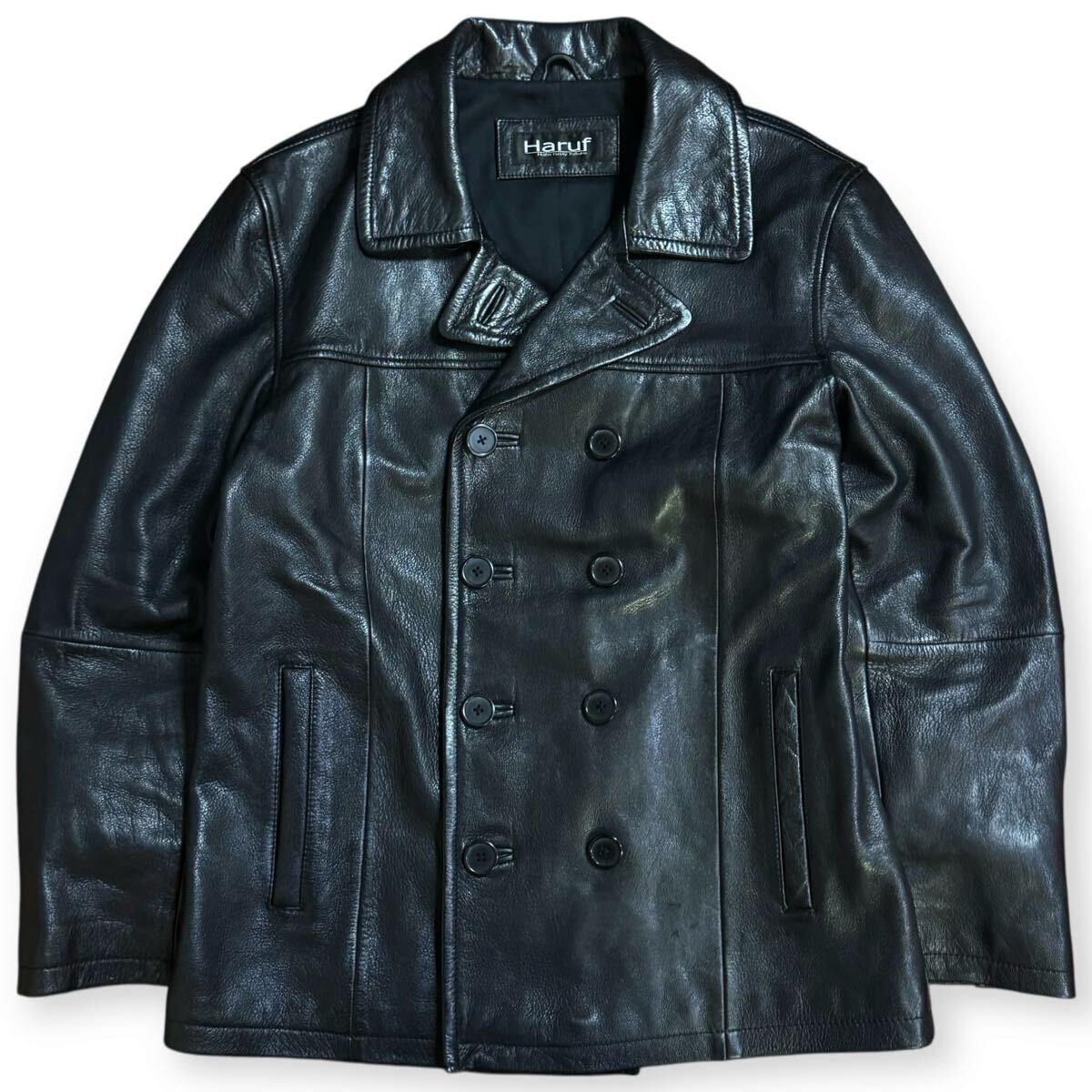 > 定価4.5万 美品 Haruf 山羊革 ビンテージ加工 レザーPコート ブラック 3Lサイズ ゴートレザー 山羊革 ベジタブルタンニンなめし革