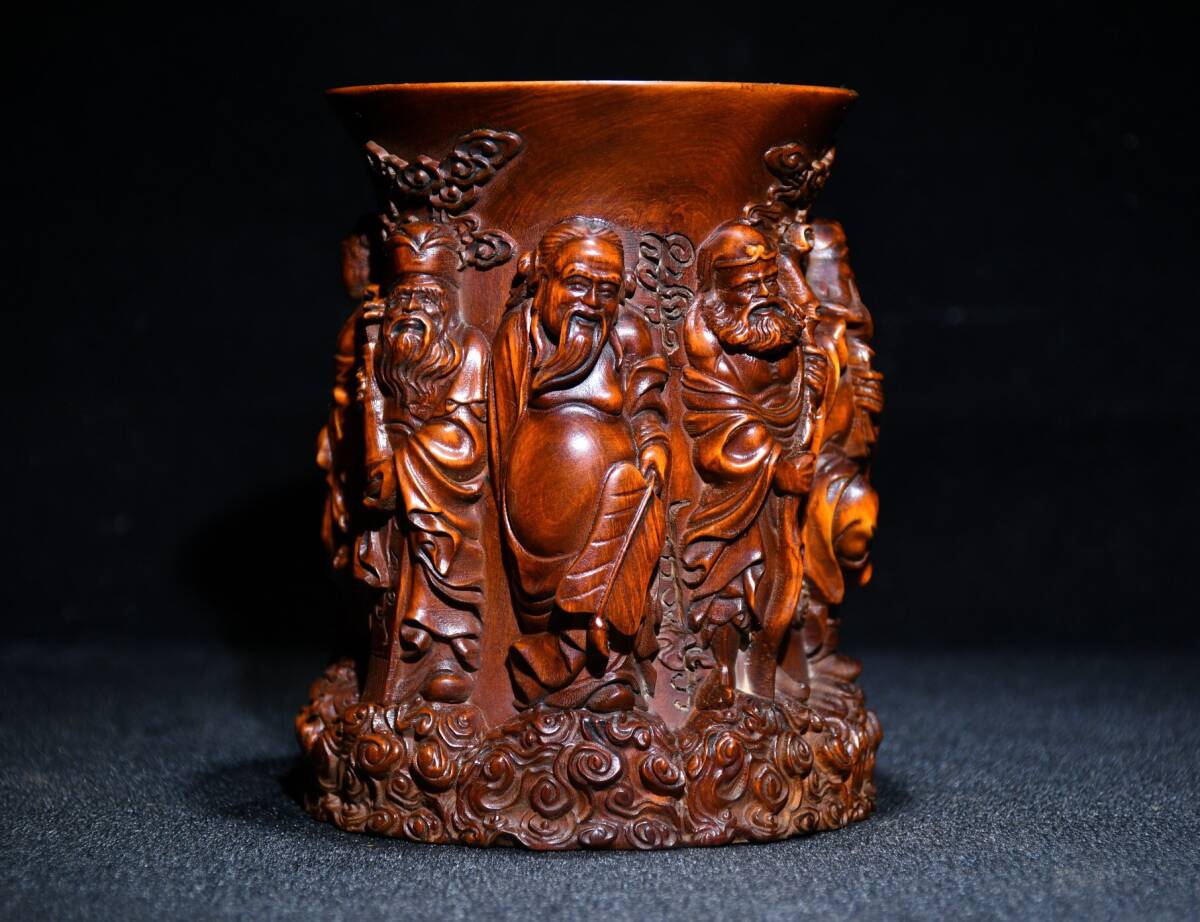 - 【仁】『黄楊木製・細密彫・八仙紋・筆筒・置物・賞物』極細工 古賞物 中国古玩 古美術 古美味