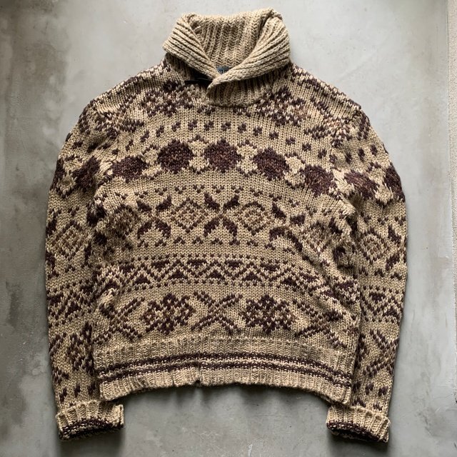 > 【XL】Polo Ralph Lauren リネン×シルク ショールカラーニット ベージュ×ブラウン 総柄■ビンテージ アメリカ古着 ポロラルフローレン
