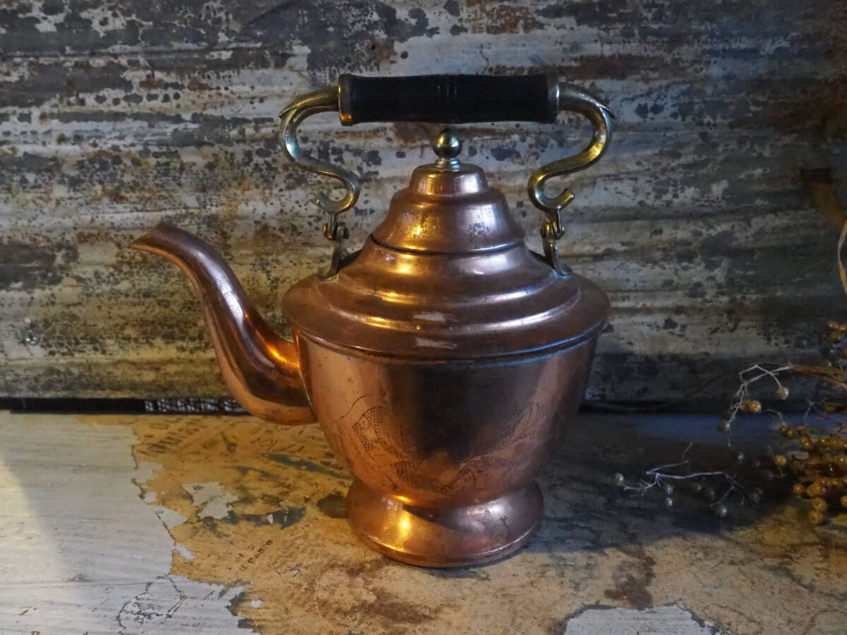 - 【フランス蚤の市アンティークティーポット】銅製ケトル骨董やかんミル薪ストーブ古道具インテリアカフェバーコーヒー紅茶