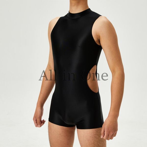 > 169-207-25 メンズ ツヤツヤ サイドカット ジャンプスーツ【ブラック,Mサイズ】男性 コスプレ 光沢 サテン セクシー ボディスーツ .2
