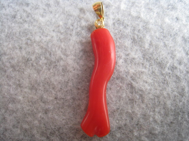 - [SAMU]綺麗!!上質天然血赤珊瑚3.5cmx1.0cm ダイヤモンド k18金具ペンダント美品!