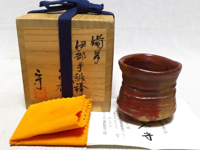 - 伊部手緋襷ぐい呑 多久守 共箱 共布 栞 酒器 酒呑 備前焼