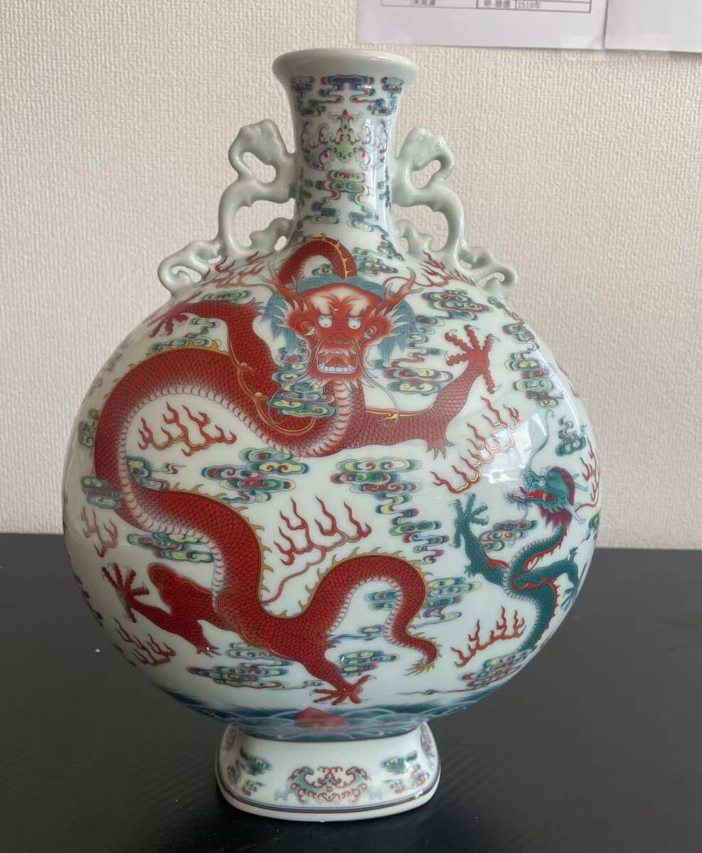 - 中国磁器 清代乾隆粉彩 月を抱く龍 花瓶 工芸品 中国美術