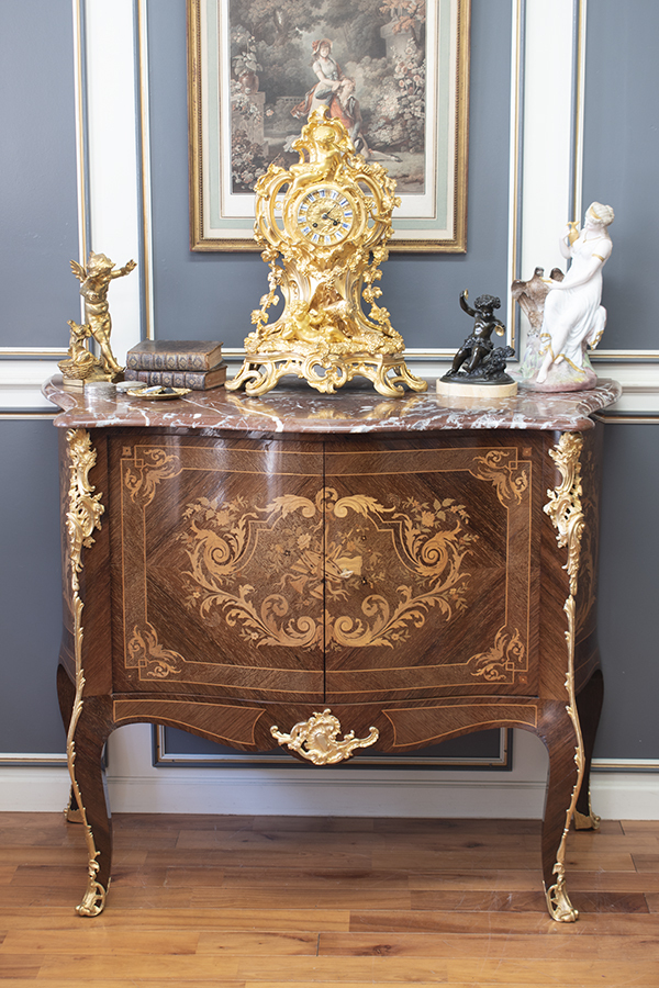 美しさだけではなく品質も素晴らしく、構造、材料、象嵌やブロンズのデザイン・・、 すべてにおいて一級の技術が盛り込まれており、上流階級の御宅で使われていたことが一見してわかるお品です。