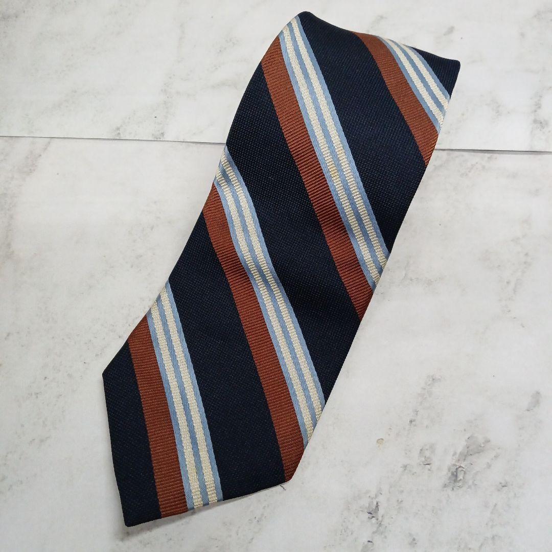 - フェアファックス ネクタイ 紺×水色・茶・白のストライプ 絹100%【n314】