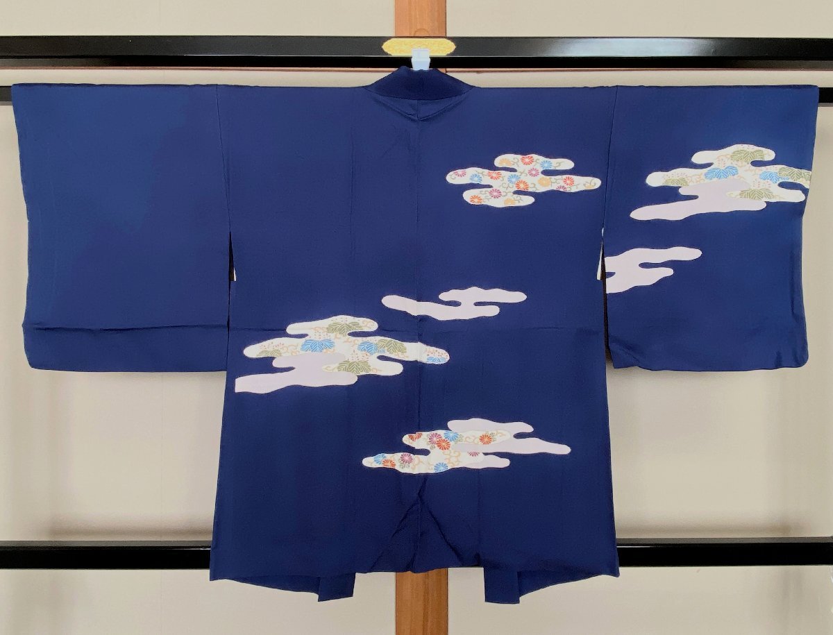 > 107B/★羽織★紐付き アンティーク コバルトブルー 雲柄 モダン レトロ お洒落 リメイク素材 古布 和装 リサイクル着物
