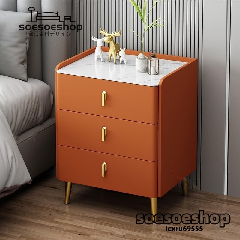 - サイドテーブル 引き出し 3 つ付き モダン ト引き出し付き ミニテーブル 寝室用家具 40cm オレンジ