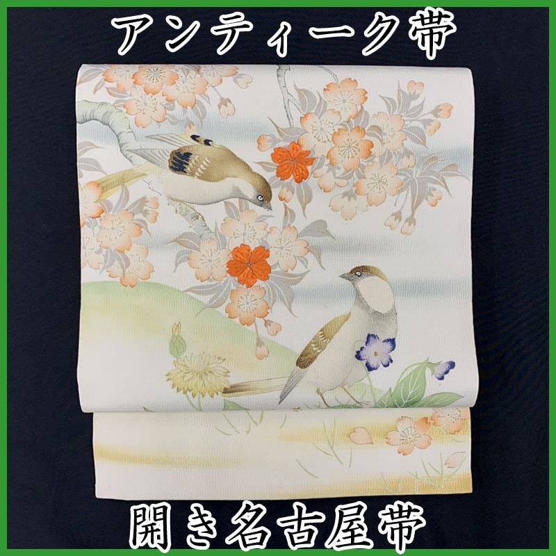 > ◇きものマーチ◇アンティーク帯 開き名古屋帯 雀 桜 たんぽぽ 菫 レトロモダン 大正ロマン 昭和レトロ 和洋MIXコーデ◇状態良好 503an110