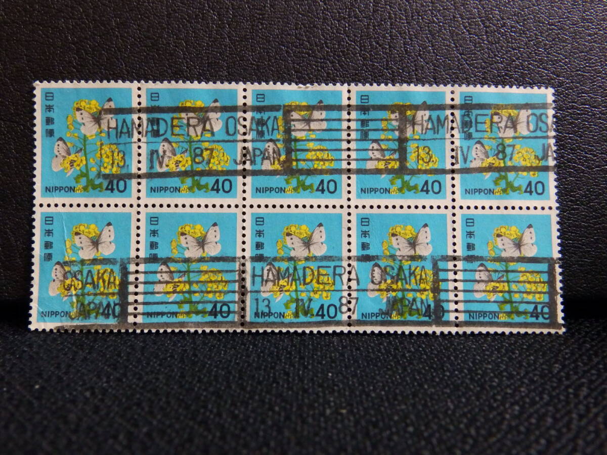 - 【台湾宛実逓便より】 菜の花と蝶40円 10枚ブロック 欧文ローラー印 HAMADERA OSAKA 13.Ⅳ.87 JAPAN