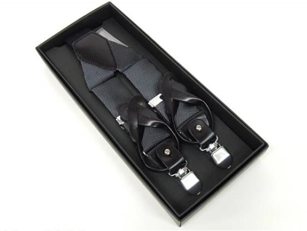 - Y型2wayサスペンダー 京都産ネクタイ生地 本革使用 日本製 濃グレー 市松模様 35mm 革足&クリップ