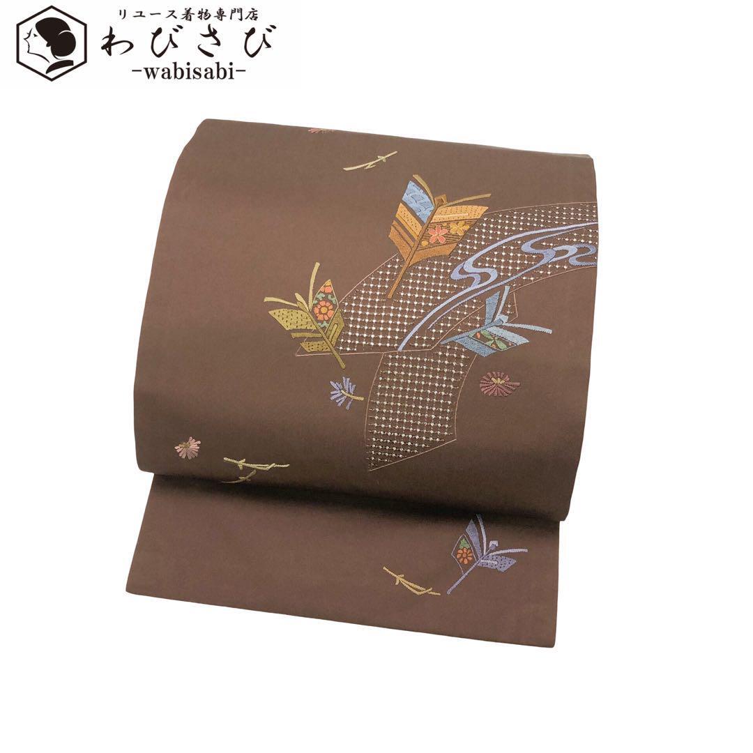 > 名古屋帯 汕頭刺繍 地紙に流水 矢羽に花模様 金糸 脂色 O-4777 着物 きもの kimono 和服 和装 中古 リサイクル着物 【送料無料】