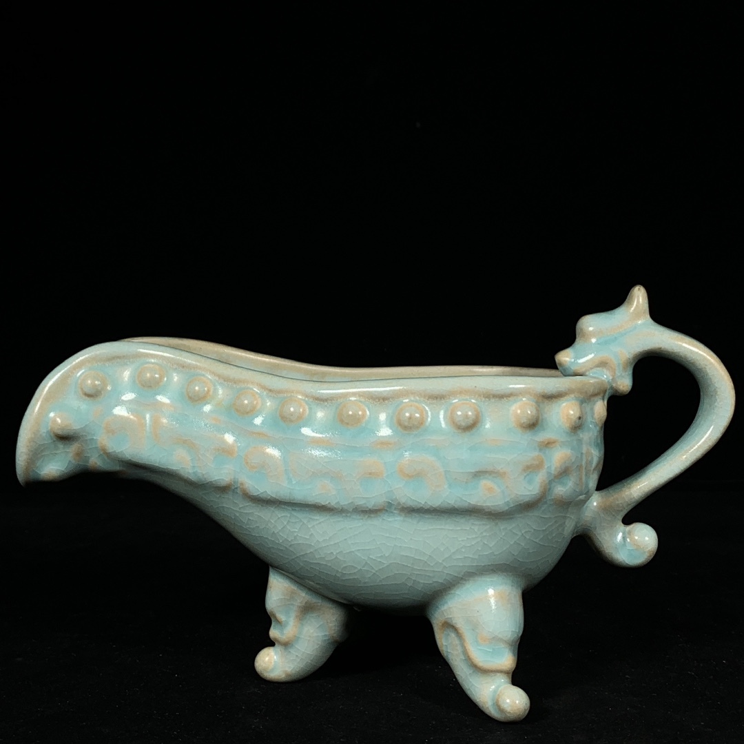 - 宋時代 汝窯 龍把杯 杯子 茶道具 三足杯 極細工 古賞物 古美味 東洋彫刻 時代物 骨董 中国古美術