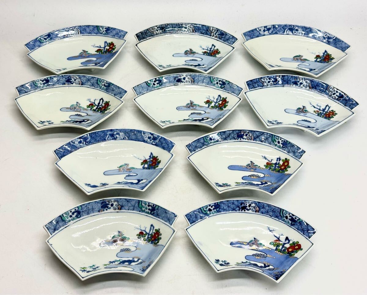 - 京焼 在銘 扇形花鳥図皿 十枚 金彩 懐石