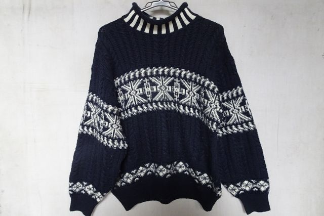 - S7167G/長袖セーター/アクリル・毛混ニット素材/ハイネック/ノルディック柄/ケーブル編/紺/ネイビー/白/ホワイト(3/6R7)