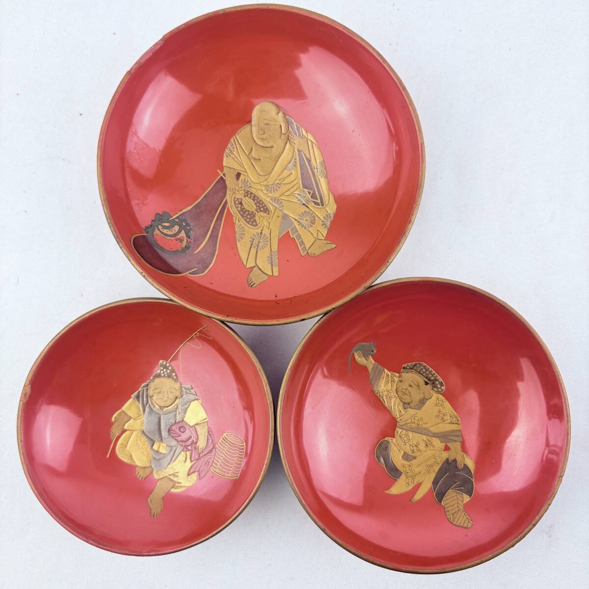 - 【送料込み】古い 蒔絵 人物 盃 酒器 酒杯 和食器 朱塗り漆椀 三客セット 骨董 茶道具 #676400