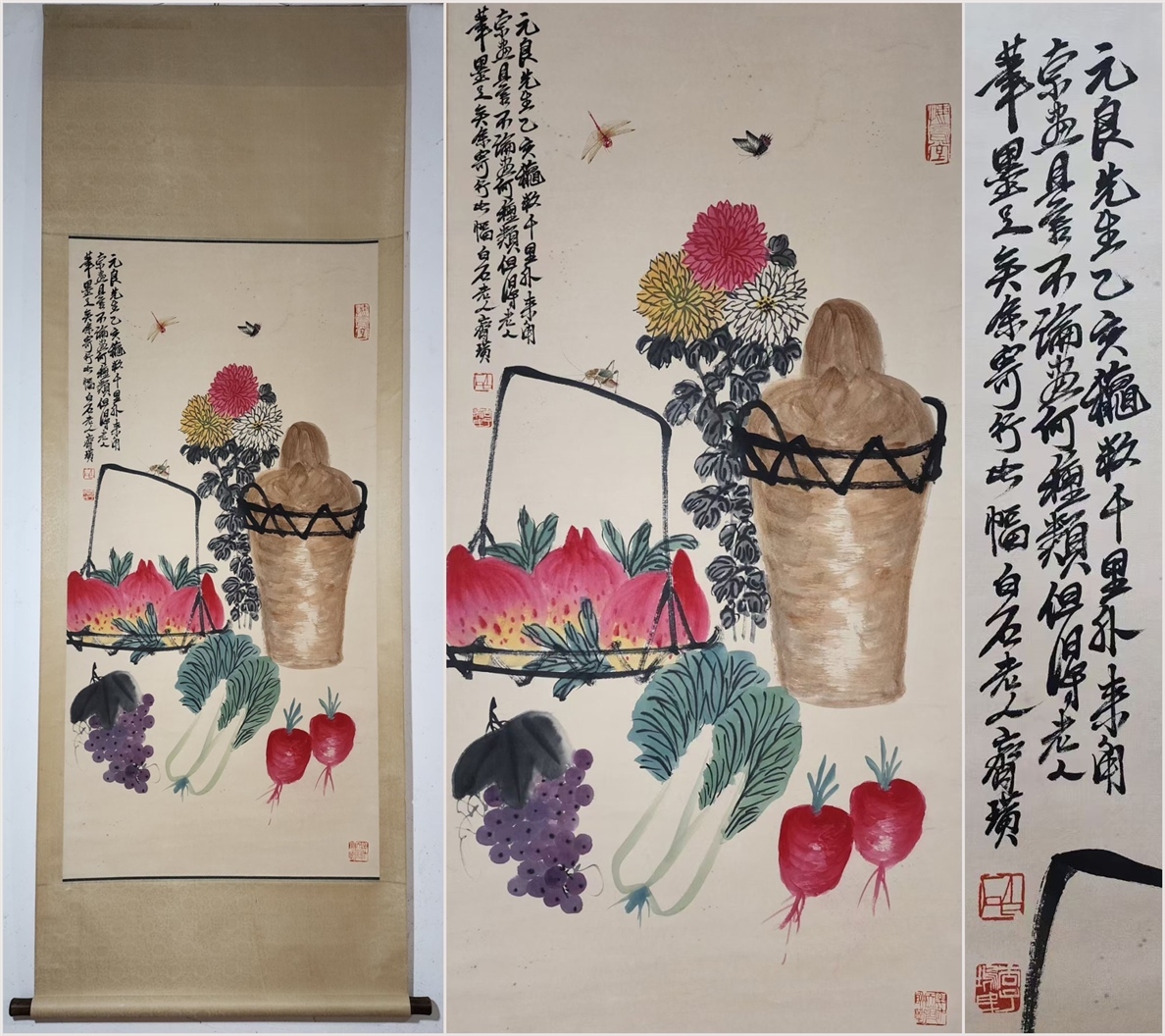 - 古美術 掛け軸 中国・近現代 「斉白石書」 紙本 【草虫花卉図】 立軸 書道 巻き物 肉筆保証 唐物 古画 画心136.5x67cm LT-250302