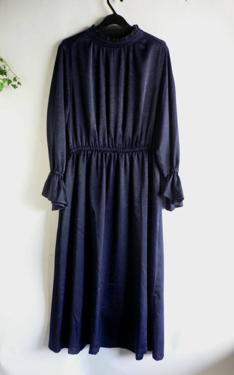 - フェリシモ 紺 襟フリル ベル袖 ロングワンピース Lサイズ 11号