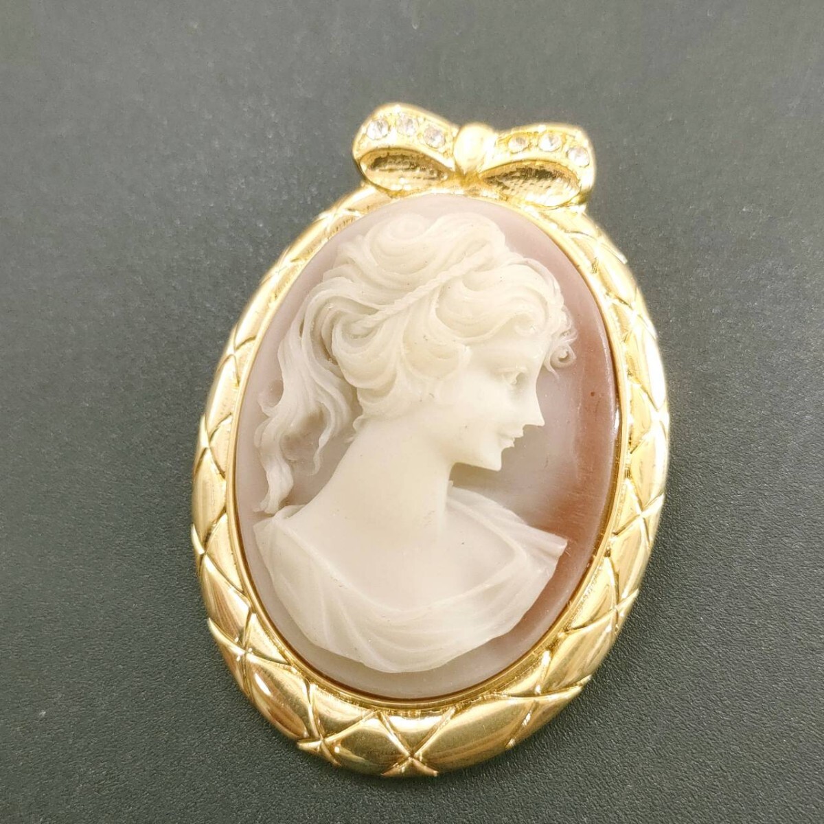 > ☆ほぼ未使用 カメオ風 ブローチ 高級感 西洋 女性 アクセサリー ヴィンテージ ラインストーン リボン レトロ シェル風 横顔 コサージュ 7
