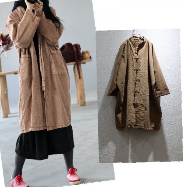 - jm 高質 厚手 麻100% カーディガン 羽織物 トップス アンティーク風 ロマンファッション ゆったり カーキ色系