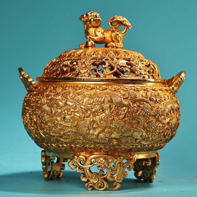 - 旧蔵 清 乾隆年製 純銅 高浮彫鏨刻 塗金工藝 獅子熏香炉 銅製品 銅器 極細工 中国古玩 古美術 骨董品 203-16