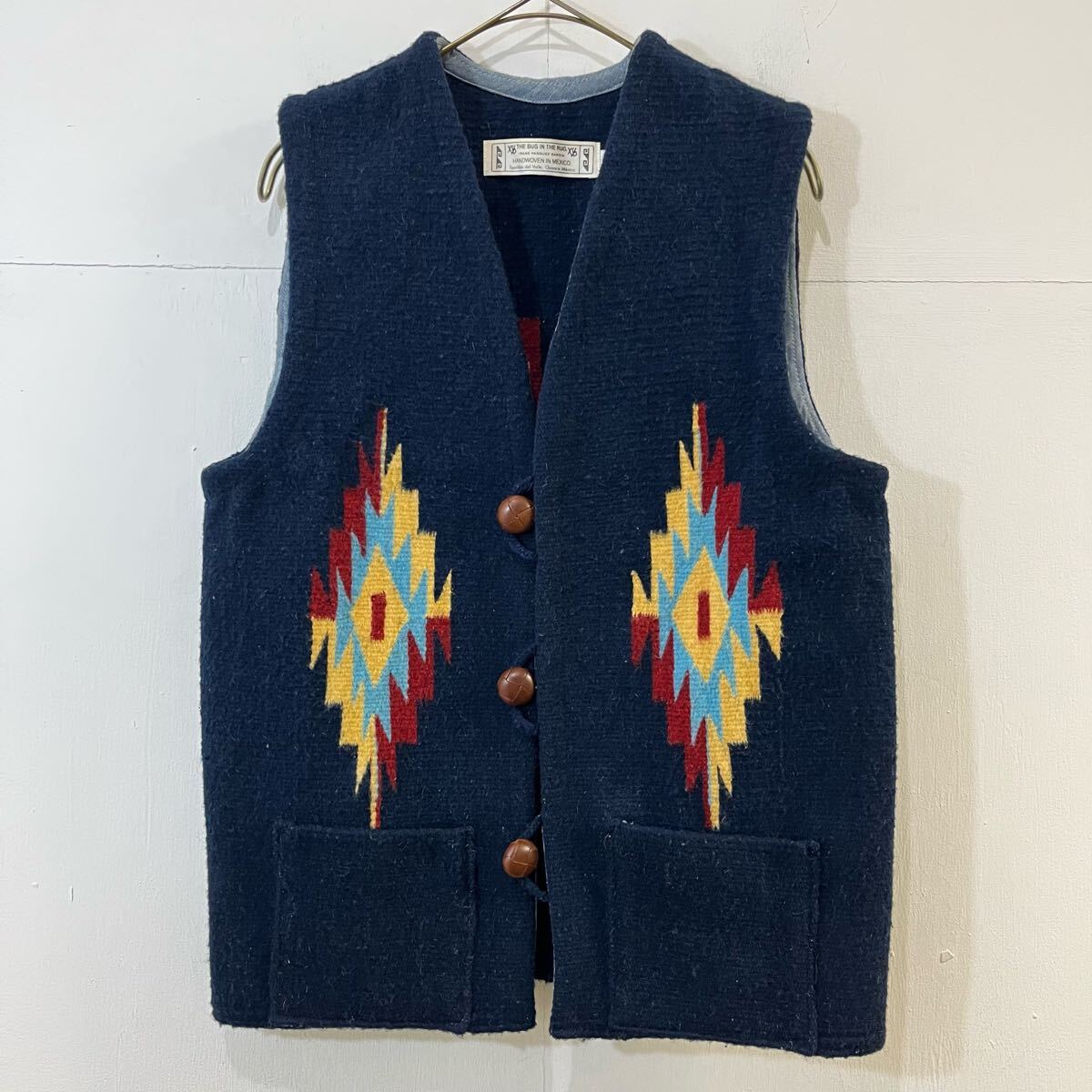 > THE BUG IN THE RUG メキシコ製 ベスト ネイティブ柄 チマヨ オルテガ ナバホ ウール ジレ Vネック ネイビー S 希少【送料一律/同梱可能】R