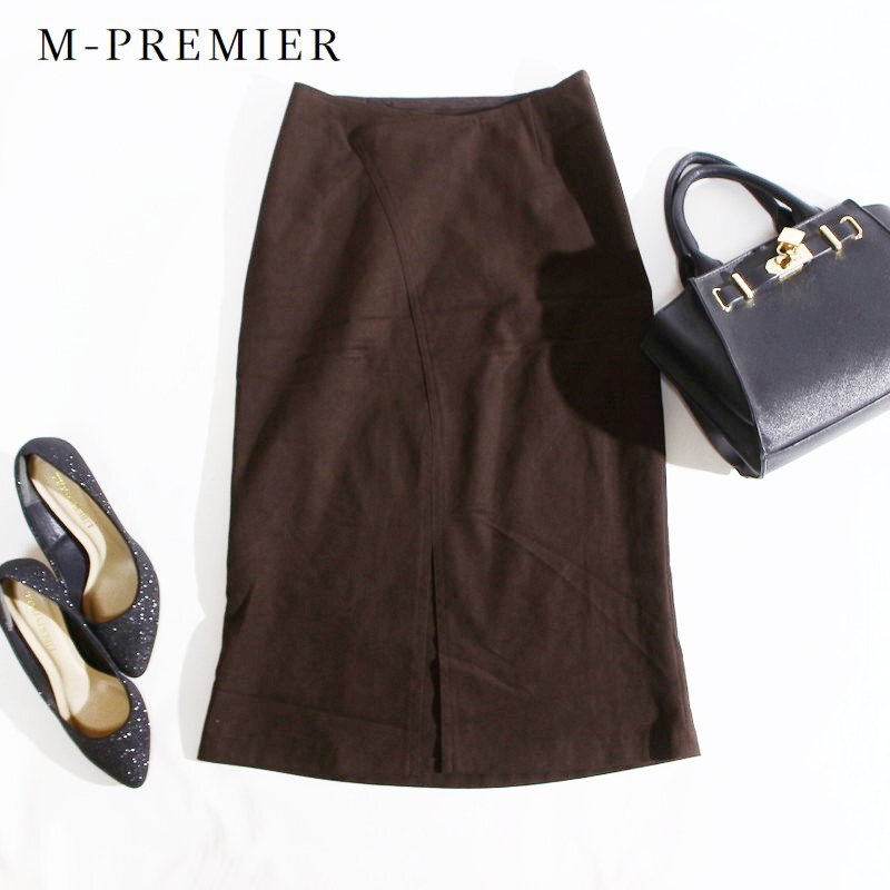 - Mプルミエ M-PREMIER 綺麗め 秋 冬 ミモレ丈 ミディ タイトレザースカート スエードタッチ スエード M 9号 ブラウン タイトスカート