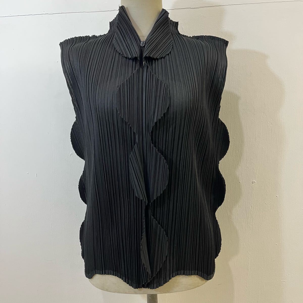 > ISSEY MIYAKE PLEATS PLEASE 希少 プリーツブラウス 半円カッティング ノースリーブ プリーツシャツ 黒 レア【レターパックプラス郵送可】R