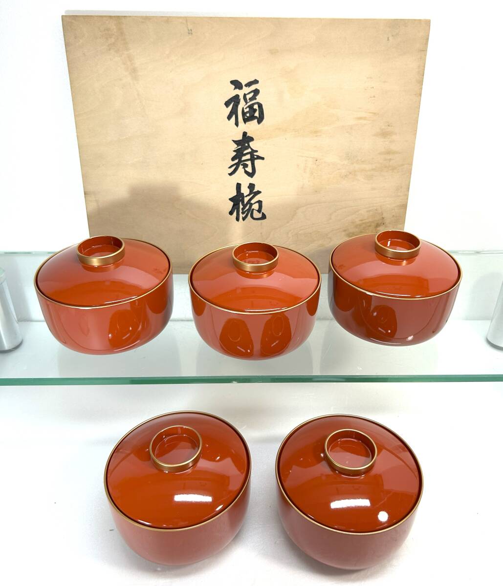 - 山中漆器 福寿椀 5客揃 漆器 汁椀 金縁 汁椀 椀物 木箱入り