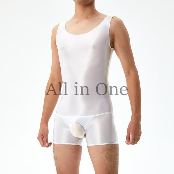 > 169-174-24 メンズ ツヤツヤ オープン ボディスーツ【ホワイト,Mサイズ】男性 コスプレ 光沢 エロ サテン セクシー ジャンプスーツ .1