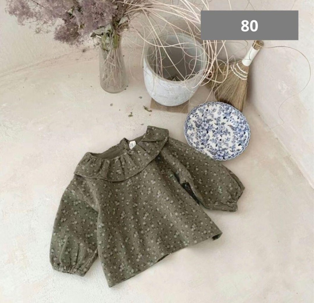 - 【新品】カーキ 長袖 小花 トップス フリル 襟 80 韓国子供服
