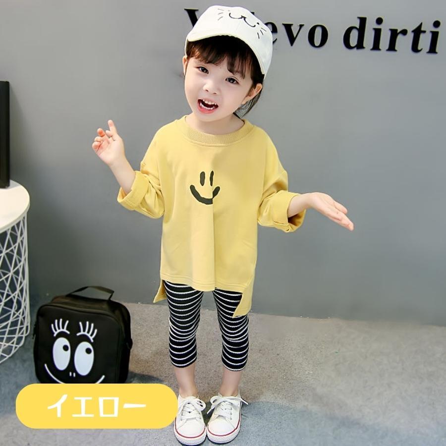 > イエロー 130cm ニコちゃん イラスト 長袖 Tシャツ ロンT カットソー 春 秋 韓国子供服 スマイル ロング丈 女の子 ガールズ