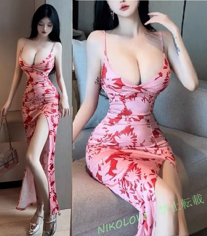 > ☆新品*訳あり*セクシー**とろみ素材*総柄*キャミソール*Vネック*カシュクール*スリット*入*ロング*ワンピース*LF656
