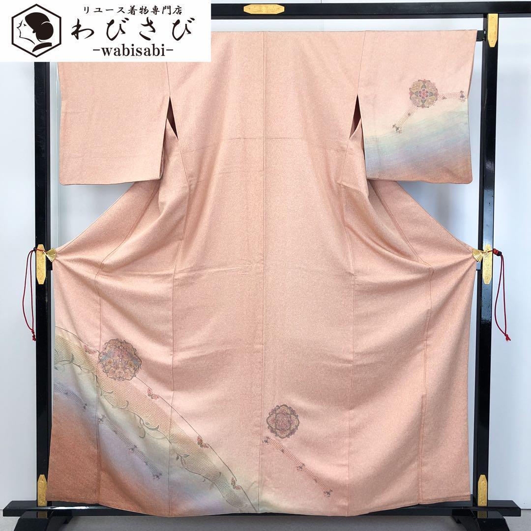 桃染色ベースのお色味にグラデーション、汕頭刺繍、相良刺繍などの刺繍柄の華柄模様、鳥、蝶々などの柄裄がデザインされた素敵な柄裄のお品でございます。
