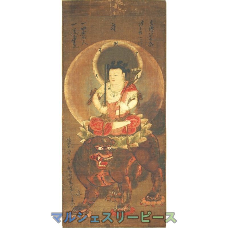- 唐密 東密 五髷文殊菩薩騎獅像 文殊菩薩 梵字種子字 文殊師利 曼殊室利 法王子 3世古仏 諸仏師 貢緞子 仏教美術 未表装Y38203