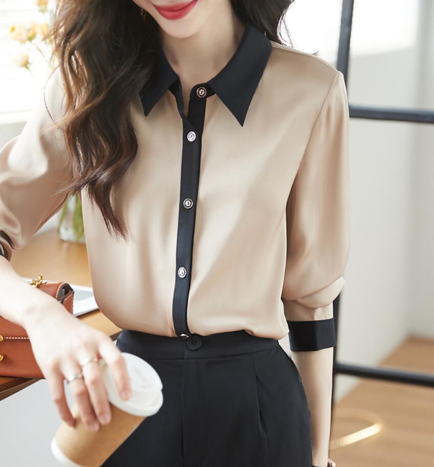 - 春新作/優雅で オフィス ブラック 長袖 高級感 配色 サテンシャツ OL 通勤 お出かけ サテン風シャツブラウス トップス 大人女性ブラウス /