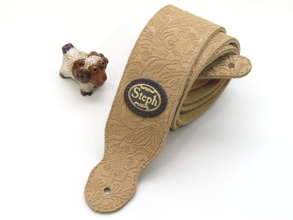 > [新品] Steph)レザーストラップ BS-1029 スエード/タン エンボス加工 ギターストラップ Made in CANADA.