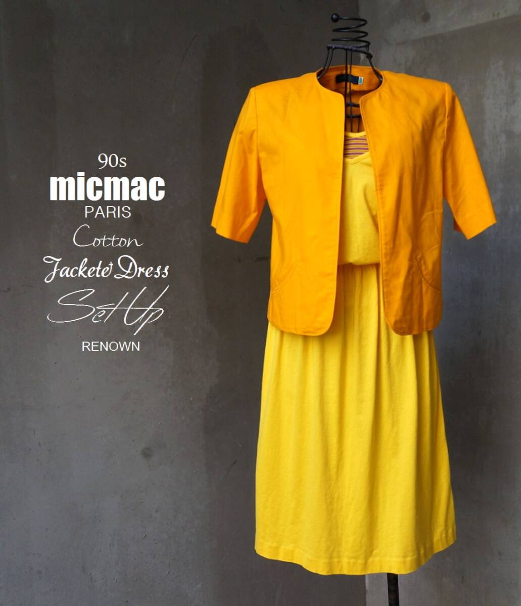 - 90s レナウン RENOWN ミックマック micmac PARIS オレンジ ノーカラー 半袖 ジャケット & 黄色 ノースリーブ 肩紐 ワンピース M
