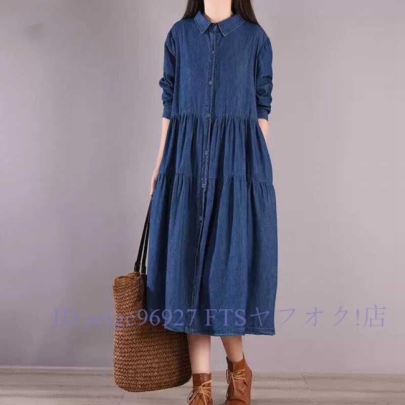 - ★新品ワンピース デニム レディース デニムワンピ 長袖 ロング Aライン 着やせ デニムワンピース シャツワンピース フレア(2色M-2XL)