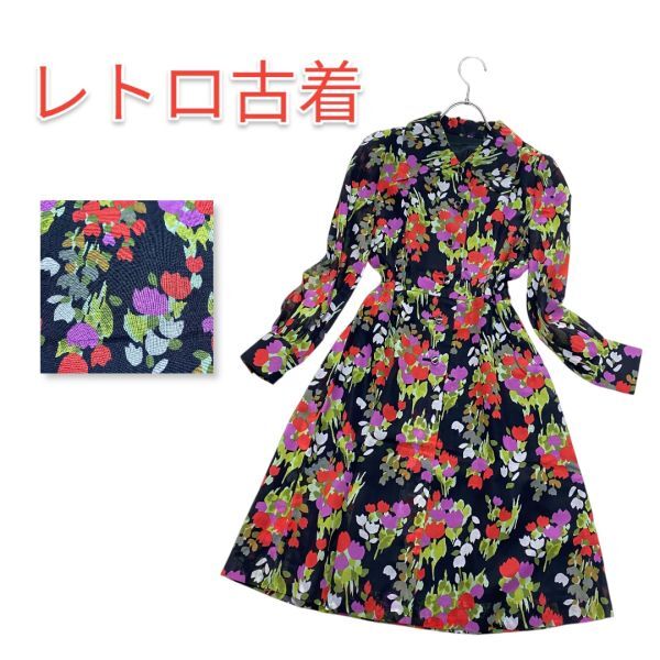 - 【レア】昭和レトロ ワンピース サイケ 総柄 花柄 黒 ヴィンテージ ゆったり エレガント オートクチュール 特注品 裏地付