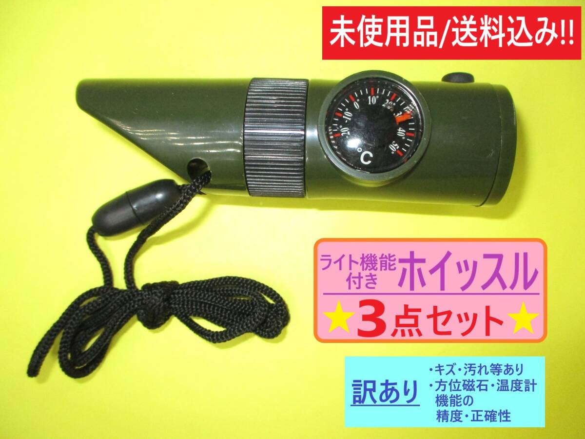 > 訳あり 未使用 ライト付き ミリタリー調 ホイッスル 笛 3点 B 海外製 紐 方位磁石 温度計 野外 アウトドア キャンプ 防災 備品 非常 持出袋