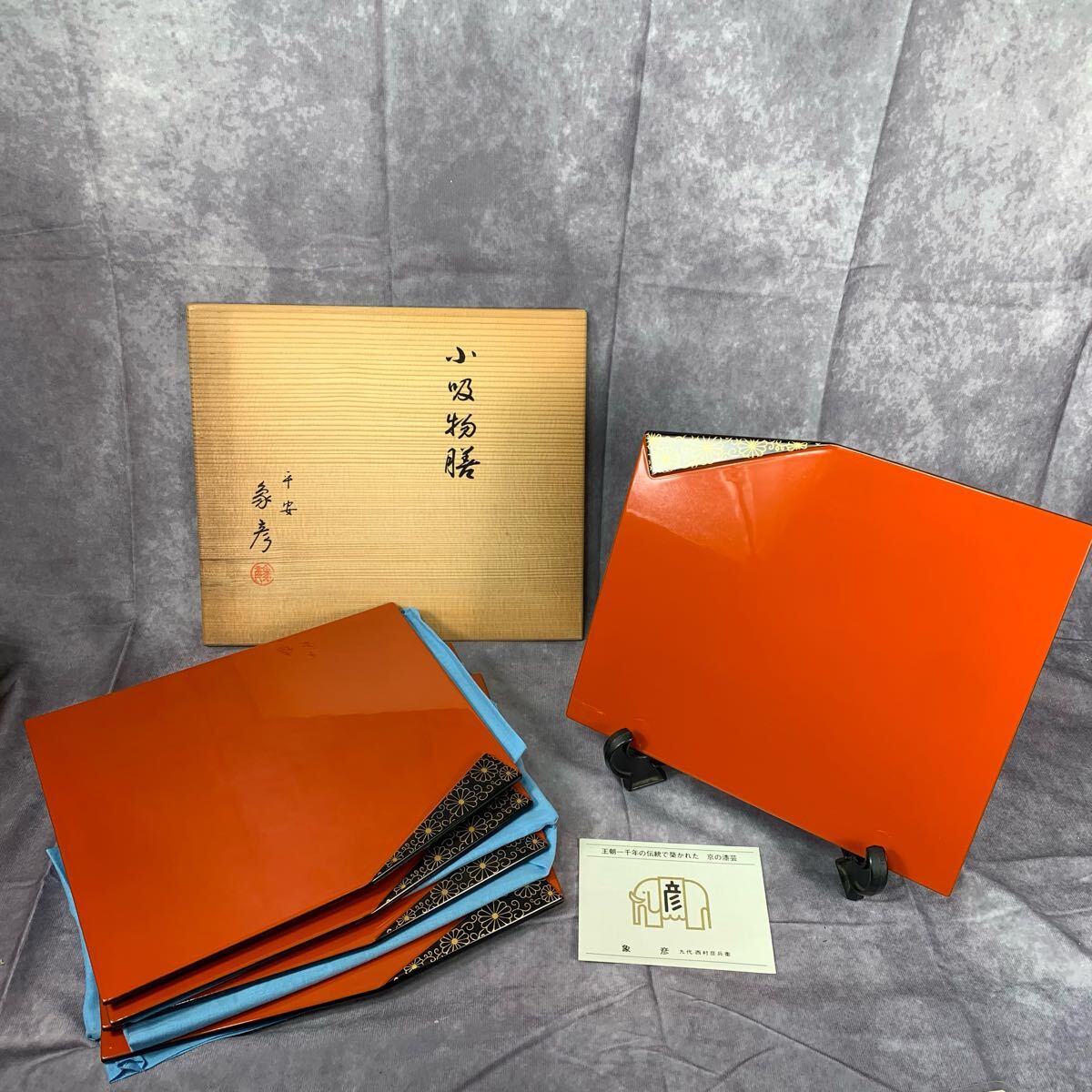 - 未使用保管品 平安象彦 作 蒔絵 折敷 吸物膳 五客 共箱 膳 懐石 料亭 美術 盆 象彦 京都 塗師 朱塗り