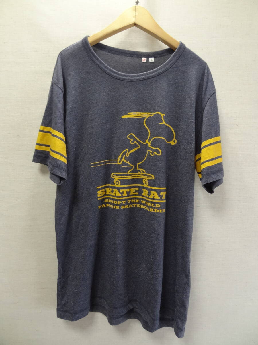 - 全国送料無料 ユニクロ UNIQLO UT X スケボーするスヌーピー メンズ くすみカラー杢ブルーグレー色 半袖 袖ラインプリントTシャツ Lサイズ