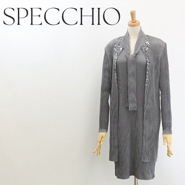 > ◆SPECCHIO スペッチオ プリーツ加工 スパンコール装飾 ボタンレス ロング カーディガン&ワンピース アンサンブル セットアップ グレー 40